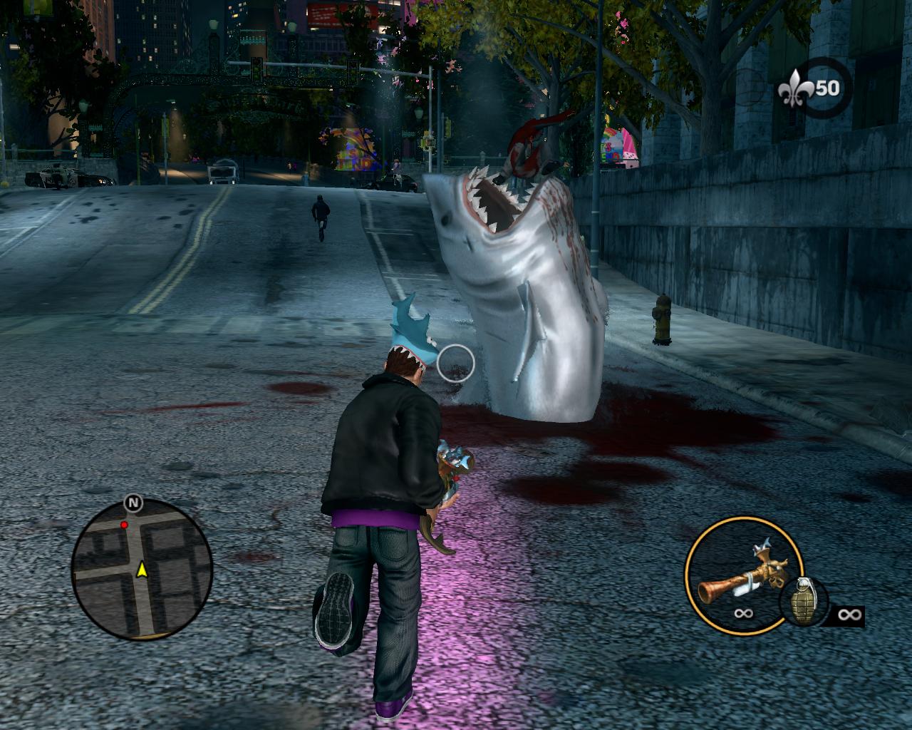 Obtained in Saints Row: The Third‘s Shark Attack Pack, this piratical blunderbuss is filled to the brim with chum, primed to subject your targets to a sticky death by choking on fish guts, right? Fire away! Wait, what’s that sound? Huh. So, uh, the fabled Steelport Sewer Shark just rose from the ground and devoured the target…Well, I guess he bit off more than he could chew, eh?
