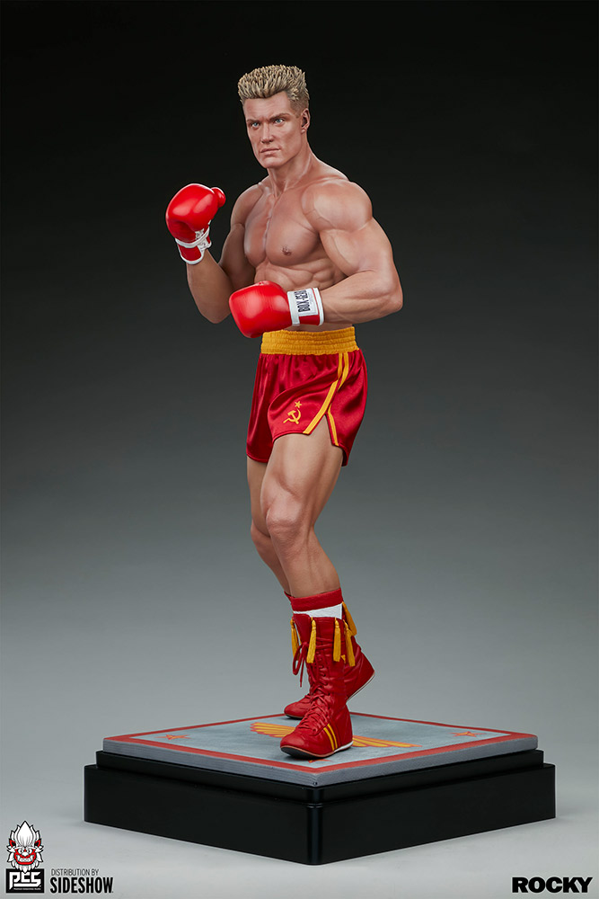 The Ivan Drago 1:3 Scale Statue features a mixed media outfit with custom tailored fabric elements to give collectors multiple display options. His red and gold shorts are accented with a hammer and sickle to evoke the flag of the Soviet Union, and the collectible also includes a removable matching jacket that can be displayed on the figure or on the accompanying proximity stand for an alternate costume configuration in the ring. The Ivan Drago Statue also features sculpted red and gold boots, red and white socks, and red gloves to complete his fight-ready look. Pit the Ivan Drago Statue against the Rocky 1:3 Scale Statue by PCS for a collectible showdown between two cinematic icons in your home.