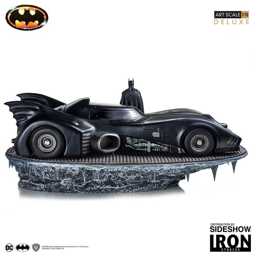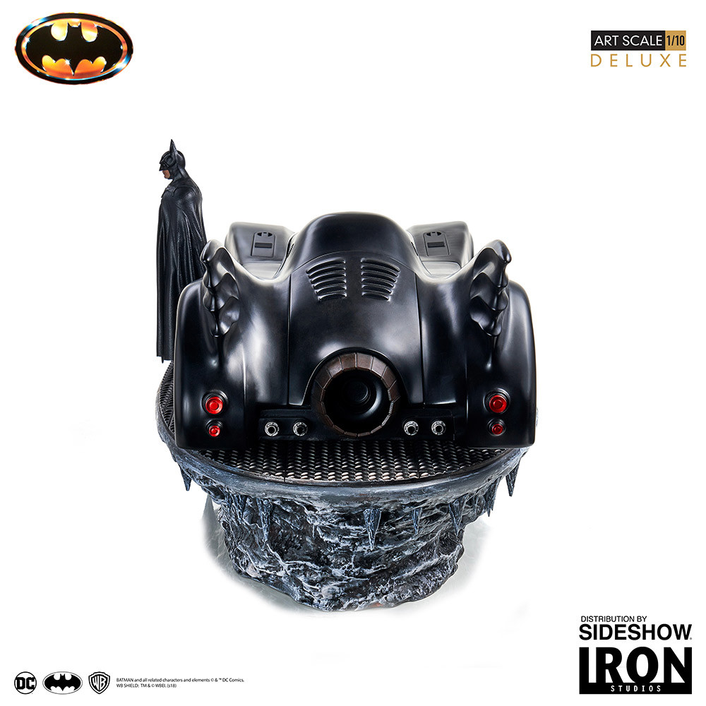 Sideshow and Iron Studios present the Batman & Batmobile Art Scale 1:10 Deluxe Statue Collectible Set. Based on the 1989 movie Batman directed by Tim Burton. Batman is posed with the iconic Batmobile. Batman & the Batmobile are displayed on a Batcave themed base.