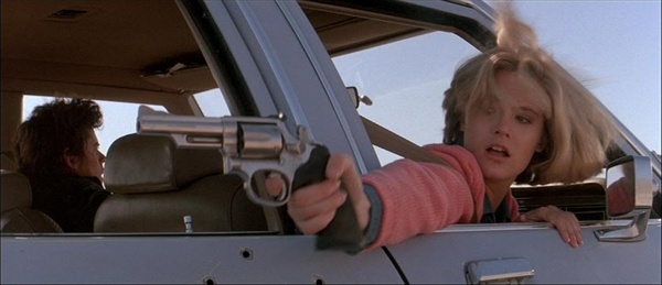 The standout is a pulsating highway chase as Jim Halsey (C Thomas Howell) and Nash (Jennifer Jason-Leigh) are escaping the police and the titular hitcher (Hauer) blazes in to cause chaos before a chopper arrives to up the ante further. There are some great car flips and dynamic camera car work coordinated by David Burton.
