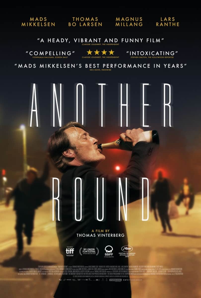 This is how Danish filmmaker Thomas Vinterberg has described his latest work, Another Round; a study of the pitfalls of drinking as seen through the eyes of four middle-aged friends looking for a new lease of life. Mads Mikkelsen plays Martin, a stuck-in-a-rut history teacher whose lack of zest is obvious to all who know him (his wife, sons, friends, and even his students). At a birthday dinner, the subject of Finn Skårderud comes up; a Norwegian philosopher who believed people were born with a low blood alcohol level, and therefore needed to drink little and often in order to properly relax into a more fulfilling life.