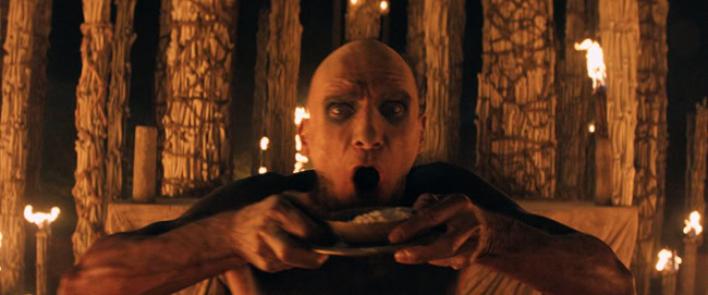 Don’t get your hopes up. This movie begins where the previous one left off, with young Spike (Alfie Williams) being initiated into the Fingers, the gang of Jimmy Savile-inspired Satanists led by Sir Lord Jimmy Crystal (Jack O’Connell) who rescued him from the infected, by having to fight to the death with another ‘Jimmy’. Alongside this, Dr. Ian Kelson (Ralph Fiennes) is regularly drugging the infected Alpha beast Samson (Chi Lewis-Parry) and teaching him about how to be a human again. In truth, Samson is addicted to the morphine in Kelson’s darts so he allows himself to be shot, but Kelson’s methods seem to be working and Samson’s humanity gradually comes back as he does not attack Kelson and learns how to speak again.