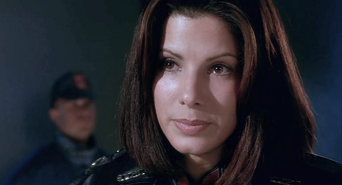 Starring Sylvester Stallone, Wesley Snipes, Sandra Bullock, Nigel Hawthorne, Denis Leary, Benjamin Bratt, Bob Gunton, Glenn Shadix, and Grand L. Bush.