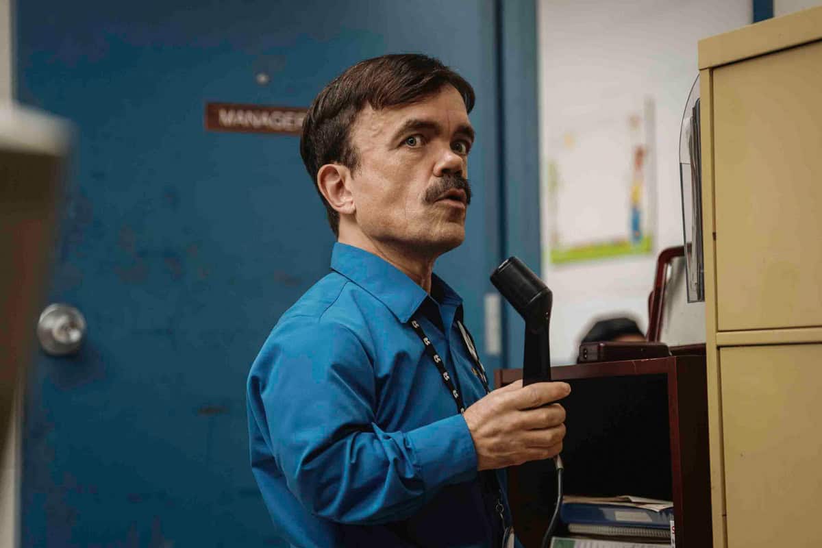 Peter Dinklage plays Mitch, the overbearing Toys “R” Us manager whose height is thankfully never mentioned in the film. He’s treated as simply another character, which is a nice change of pace. Kirsten Dunst is Leigh Wainscott, one of the store employees who’s based on the real woman who Manchester became involved with while hiding from the law in plain sight.