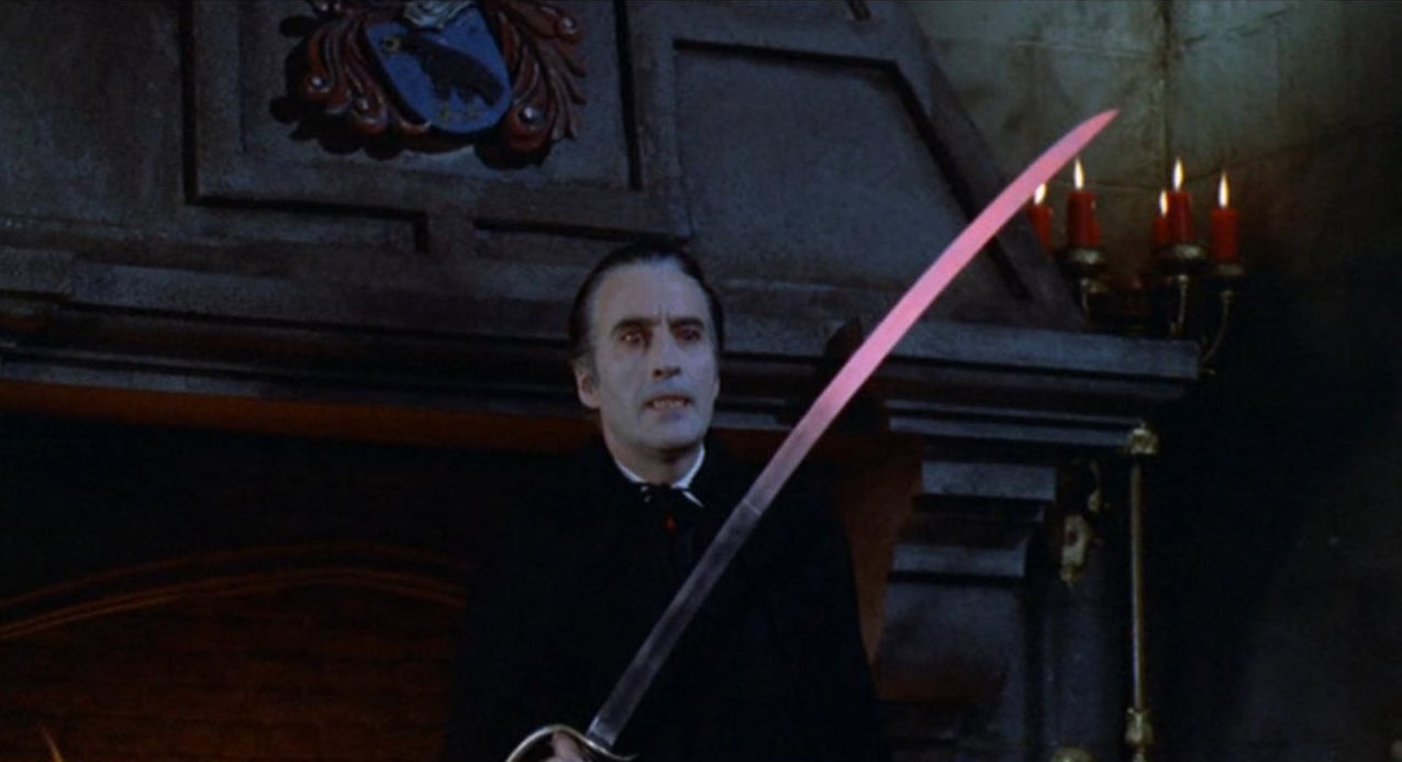 Housed in a rigid slipcase featuring new artwork two poster and a collector’s booklet, the 4K UHD picture looks fantastic, with the details of Dracula’s castle, the folds in the red capes and sheets, and the red hot blades that get used a lot all bringing life to movie that is fairly dark in comparison to the ones released either side of it. There is plenty of grain, as to be expected for a film of this vintage, but it isn’t obtrusive and is consistent throughout.