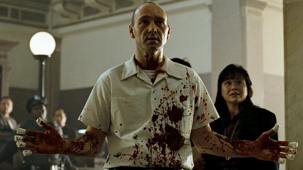 And so is William Somerset (Morgan Freeman), one-half of the police detective duo in this film. He’s world-weary and beaten down by the grimy, anonymous city where he lives (and where it’s perpetually raining), and now he has to deal with a serial killer (Kevin Spacey) who seems to be following the seven deadly sins as he works his way through various citizens.