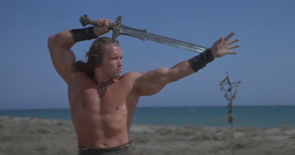 Starring Arnold Schwarzenegger, James Earl Jones, Sandahl Bergman, Ben Davidson, Cassandra Gaviola, Gerry Lopez, Mako, Valerie Quennessen, William Smith, Max von Sydow, Grace Jones, Wilt Chamberlain, Tracey Walter, Olivia d’Abo, and Sarah Douglas.