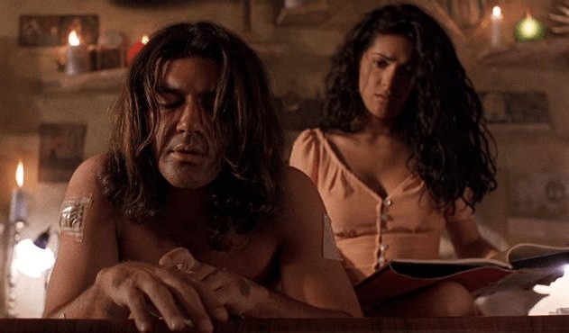 We soon learn that Bucho is Moco’s boss, and Buscemi has been spreading stories of El Mariachi on our hero’s behalf. Bucho’s men soon come hunting for El Mariachi, but he’s ready for them. After he’s injured in the ensuing gun battle, a woman named Carolina (Salma Hayek, in her break-out role) takes him to her bookstore to tend to his wounds.