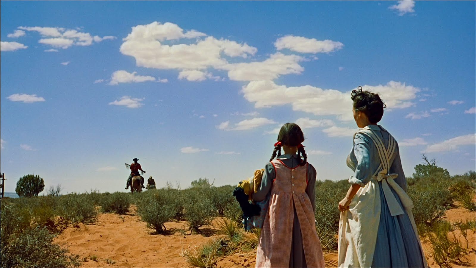 Aaron is married to Martha (Dorothy Jordan), and they have three children, including two girls, Lucy (Pippa Scott) and Debbie (Lana Wood; her sister Natalie plays the older version of Debbie). After a Comanche Indian attack on their home leaves the parents and one child dead, with the two girls abducted, Ethan leads a group in search of them.