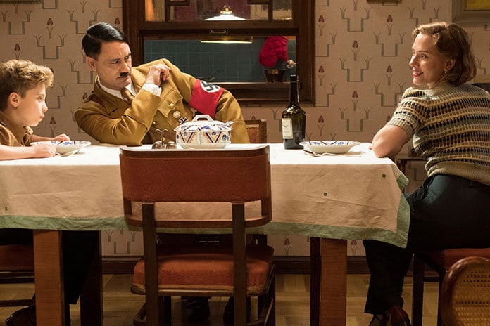 It’s somewhat ironic that in an age where social media gets fired up over Scarlett Johansson firmly believing she has a right to portray any “woman, man, or tree”, one reason writer and director Taika Waititi’s Jojo Rabbit (based on Christine Leunens’ book Caging Skies) works is due to that, albeit far less extreme and problematic, casting approach. There were no auditions in Germany scouring the nation for the latest Adolf Hitler look-alike or impressionist, or an attempt to grab someone else that has played the infamous role in another project or the slightest bit of effort put into historical research to convey the evil dictator accurately. Instead, the New Zealand born Jewish filmmaker places himself into that hideous uniform; it’s one big “fuck you” to the hate that Adolf Hitler embodied.
