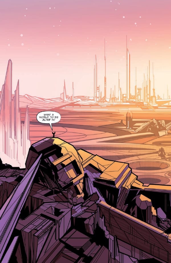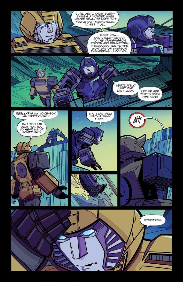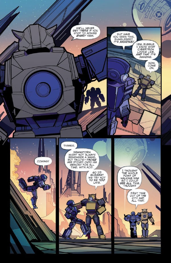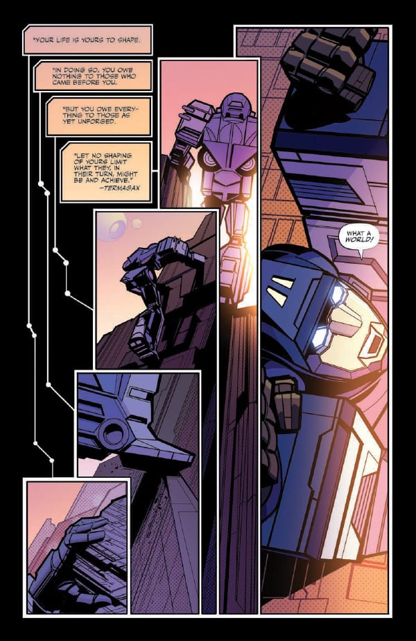 Ancient Transformers merge into its very fabric. Small, mysterious creatures skulk in its shadows. It is a truly amazing realm, long untouched by war, and exuberantly reaching for the stars. This is the Cybertron that Optimus Prime and Megatron vie for in this bold new origin—a world of seemingly endless peace! All that changes when Bumblebee and Windblade take a newly-forged Cybertronian on his first voyage through this world of wonders—they are confronted by the hard reality of the first murder to have occurred on Cybertron in living memory