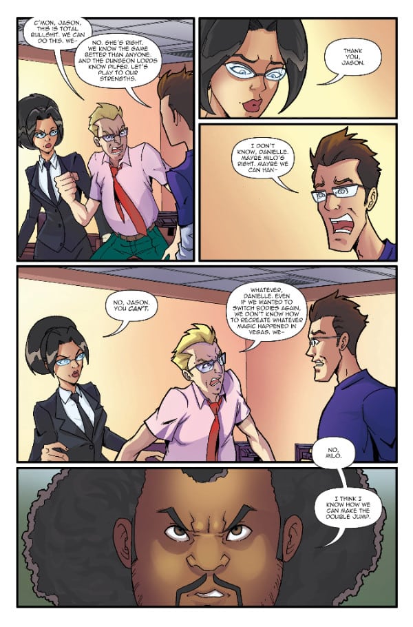 When Jason and his band of video game programmers swapped bodies with their in-game counterparts, the Dungeon Lords, in volume one, they let loose that world’s greatest villain, Pilfer the Goblin, into our world. They’ll need more than their video game skills to capture him–they’ll need the help of the Dungeon Lords themselves! It’s a return to the action/comedy series that Hannibal Tabu proclaimed is, “like manna from heaven for fans of ‘Superbad’ and geek humor.”