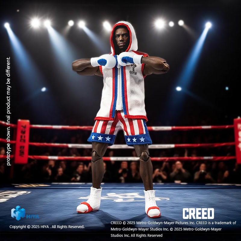 This brand new 1/12 scale action figure stands 16CM tall and faithfully recreates Adonis’s iconic appearance from the film. Featuring a serious expression and sculpted muscular physique, the figure wears star-spangled boxing trunks, paired with modern sneakers and white athletic socks—echoing the legacy of his father. The design blends classic symbolism with contemporary style, capturing Adonis’s identity as both a tribute and a new champion.