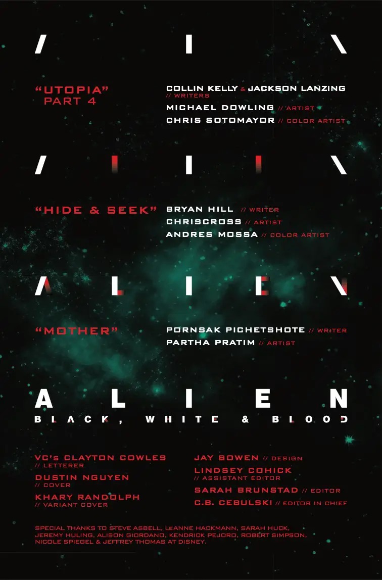 Collin Kelly, Jackson Lanzing and Michael Dowling’s “Utopia” reaches its final generation, the worst of human nature on full display. Then in Bryan Hill’s “Break Out,” a man will do anything to provide a safe home for his daughter. And Weyland-Yutani is here to help… Then Eisner and Harvey-award winner Pornsak Pichetshote brings his horror chops to the Alien universe! With more to be revealed, Alien: Black, White & Blood is a must-have for any Alien fan!