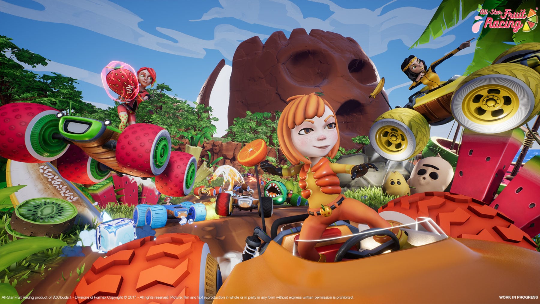 All-Star Fruit Racing takes players to a vibrant and colourful world filled with looping bends, gravity defying jumps and tubular tracks. Aspiring racers can jump into their equally colourful cars and unleash devastating fruit based moves using the Juicer power-up system which is powered by the fruit collected on the track.