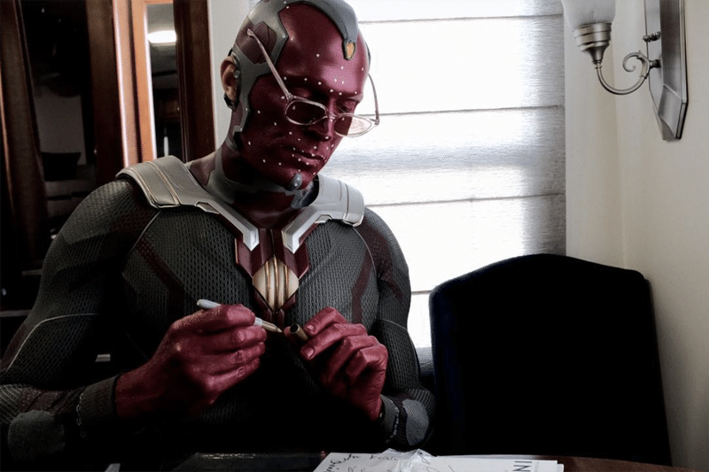 Paul Bettany has taken to Instagram to share a behind-the-scenes photo shot by Mark Ruffalo on the set of Avengers 4, which sees Bettany in full Vision costume, complete with reading glasses, as he takes care of some paperwork…