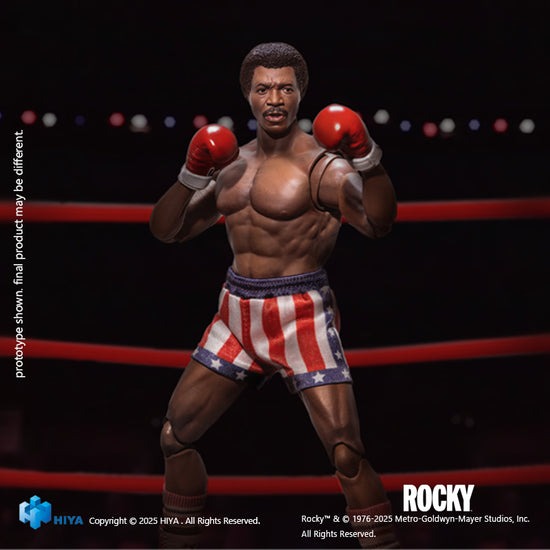 From Rocky (1976), the iconic heavyweight champion enters Hiya Toys’ EXQUISITE SUPER Series as a highly detailed 1/12 scale action figure. Standing 16CM tall, this figure captures Apollo’s powerful presence with a serious head sculpt, muscular build, and signature gear — from star-spangled boxing shorts to striped socks and high-top sneakers.