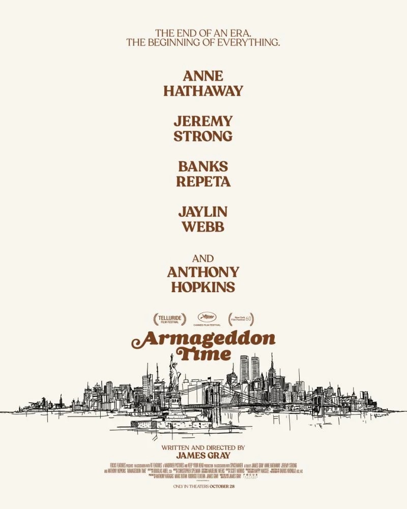 Starring Banks Repeta, Anne Hathaway, Jeremy Strong, Anthony Hopkins, Jaylin Webb, Ryan Sell, Teddy Coluca, Tovah Feldshuh, Marcia Jean Kurtz, Andrew Polk, Lauren Yaffe, Dane West, Dupree Francois Porter, Griffin Wallace Henkel, Marcia Haufrecht, Eva Jette Putrello, Landon James Forlenza, John Dinello, Jacob Mackinnon, and Jessica Chastain.