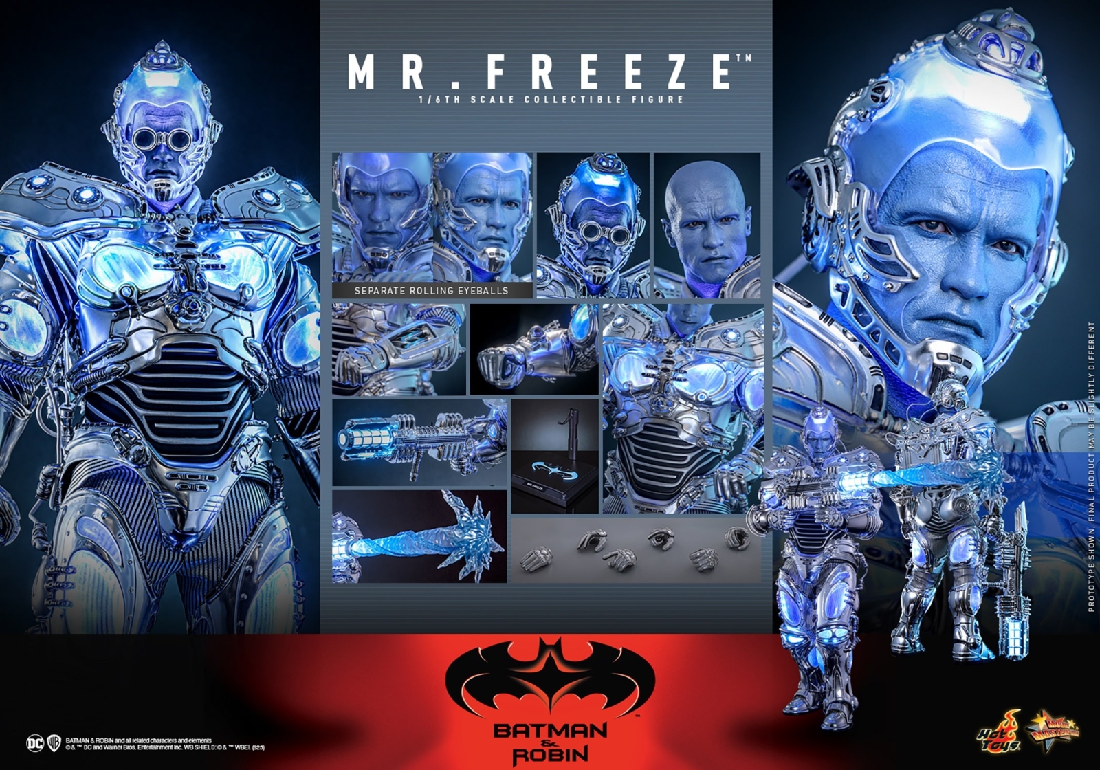 Expertly crafted based on Arnold Schwarzenegger’s portrayal of Mr. Freeze in the movie, the action figure features a newly developed head sculpt with ice-blue skin and realistic skin texture. Mr. Freeze’s specialized suit is faithfully recreated with a black and silver striped under-suit and layered armor pieces on top. Meanwhile, the armor is meticulously plated with metallic finishes and includes translucent and iridescent color parts on the upper arms, chest, thighs, and calves to enhance the futuristic aesthetic and add an extra sense of coldness for the figure. Additionally, LED-lighted design is featured on the armor, the detachable helmet, and his Freeze gun with an attachable freeze beam accessory, allowing for fans to pose him in the most dynamic ways.