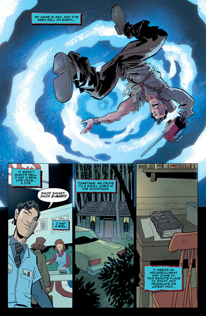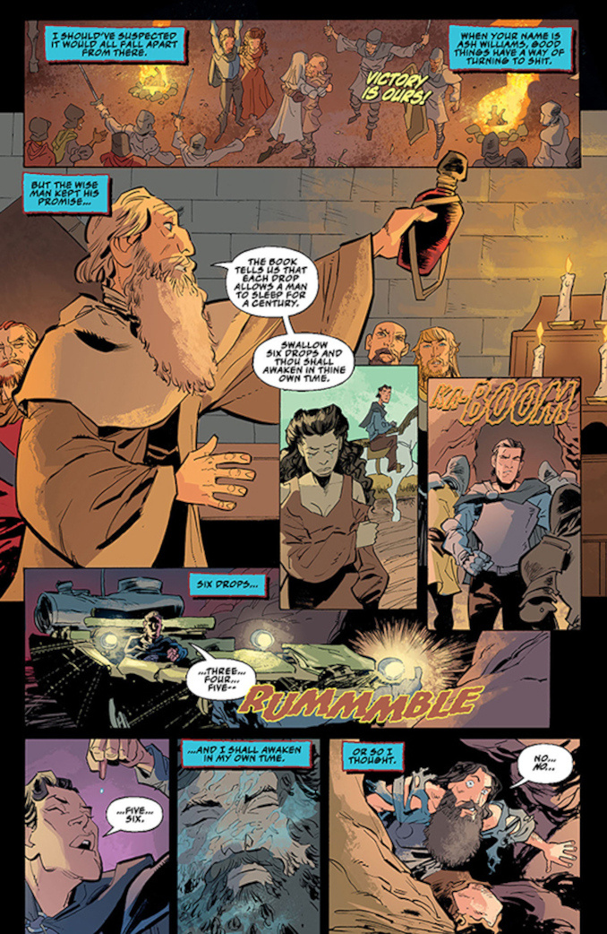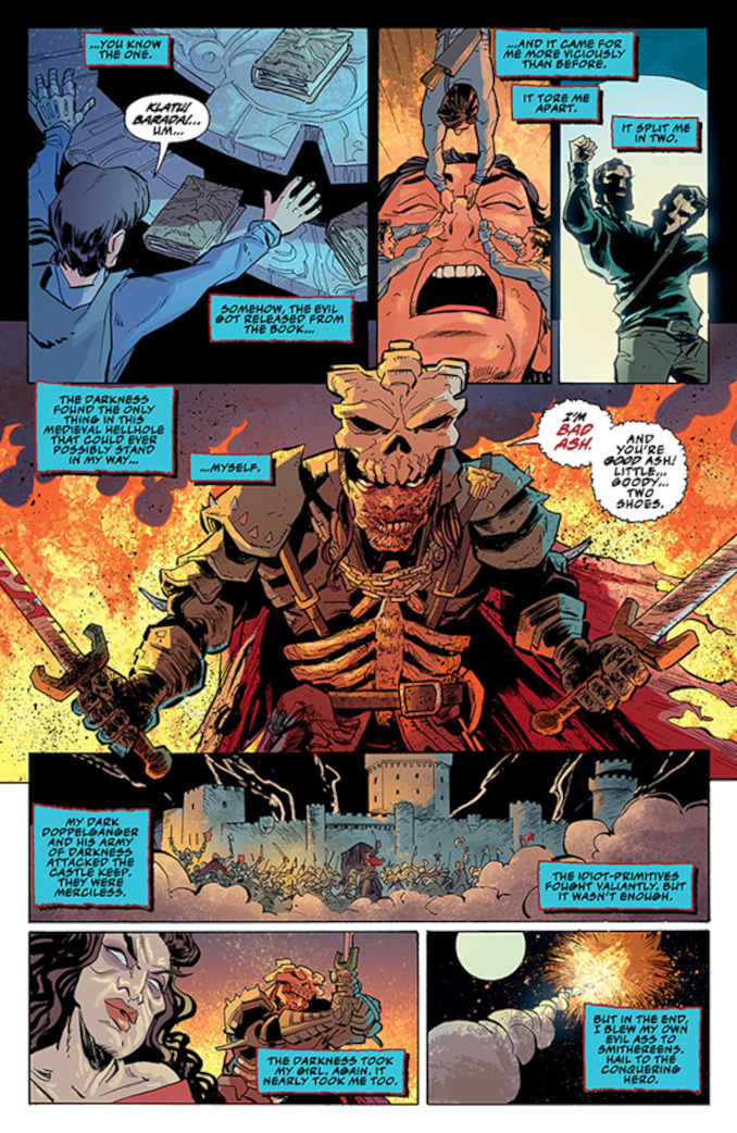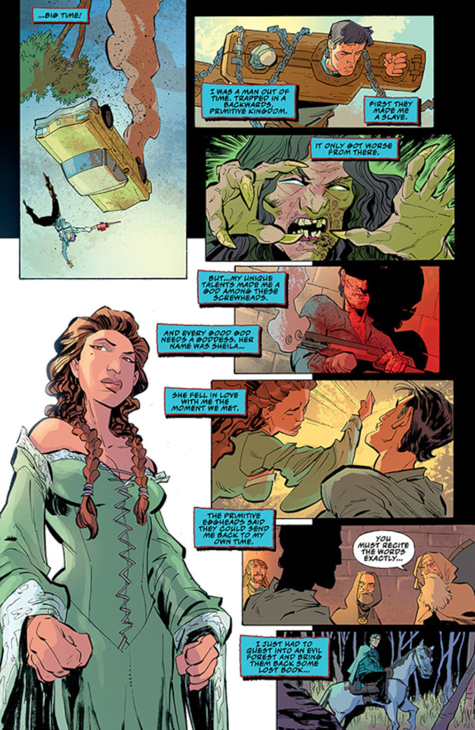 Picking up immediately after the events of Army of Darkness (the Director’s Cut, natch), Ash chainsaws his way through the Techno Army of Darkness in 2093 and defends the sacred aisles of the S-Mart in 1993! (What? How!?) Meanwhile, in the distant past, his lady love Sheila fights off a rising evil at Castle Kandar!