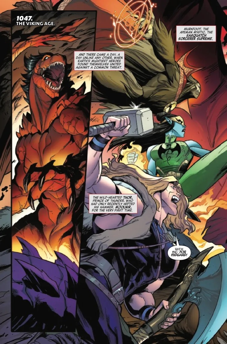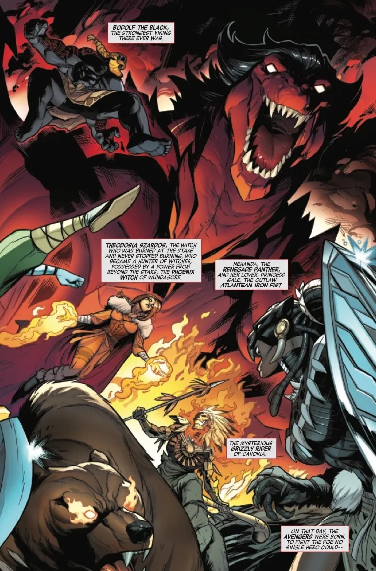 HISTORY’S MIGHTIEST UNTOLD SECRETS! If the Avengers hope to survive being lost in time, they’ll need the help of some of history’s greatest heroes, from the Thor of the Viking Age to the T. Rex Starbrand at the dawn of time, plus all the forgotten Avengers of bygone eras whose stories can finally be told.