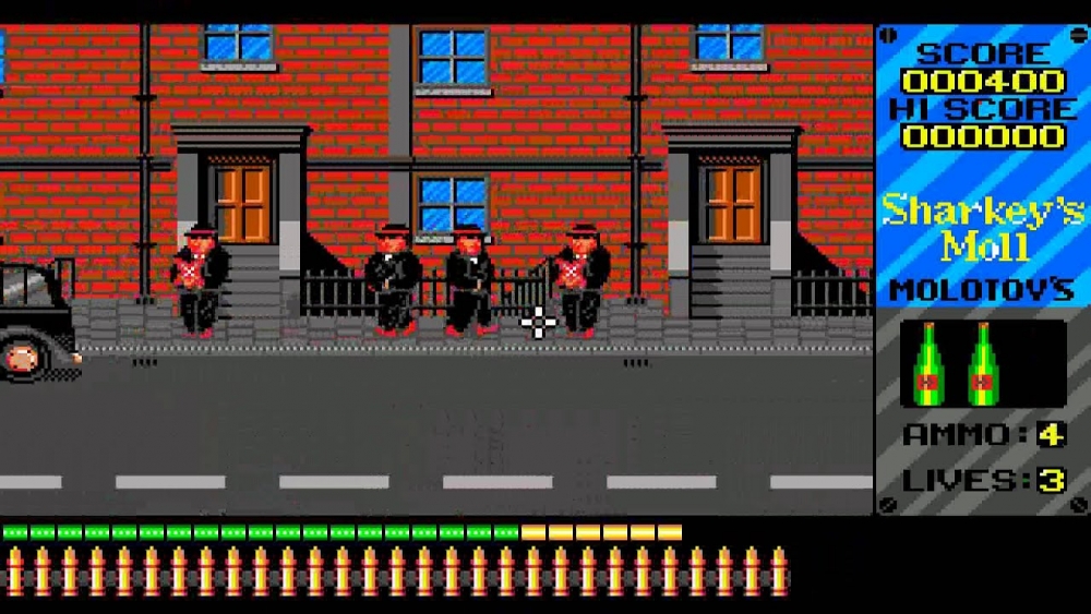 Originally, Sharkey’s Moll was meant to be an Operation Wolf clone with soldiers to shoot and everything but due to legal reasons it was all reskinned to a mobster shooting game, which in my opinion was a much better idea. Not only did they avoid possible legal implications from Ocean they also made sure the game would be remembered for standing out a bit from the contemporary soldier shooting games that were popular.