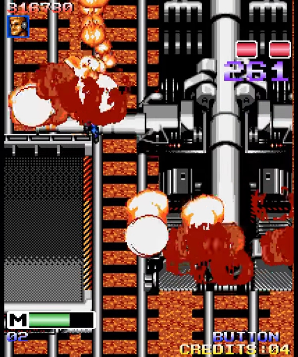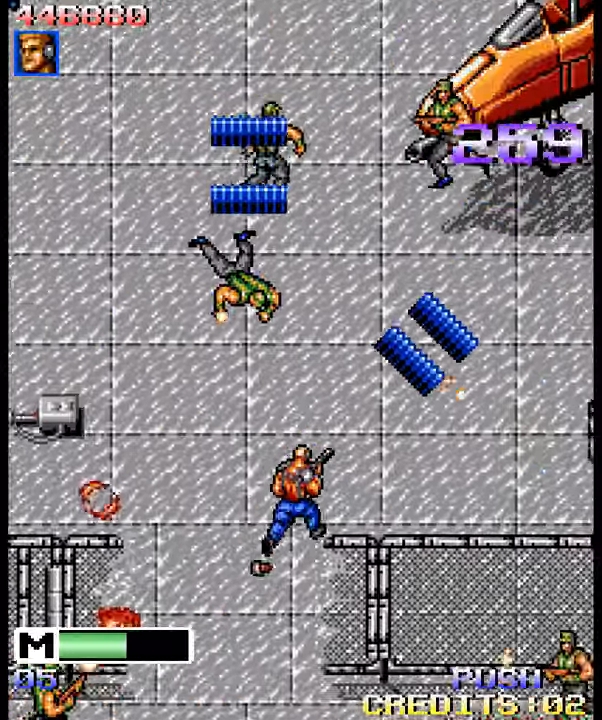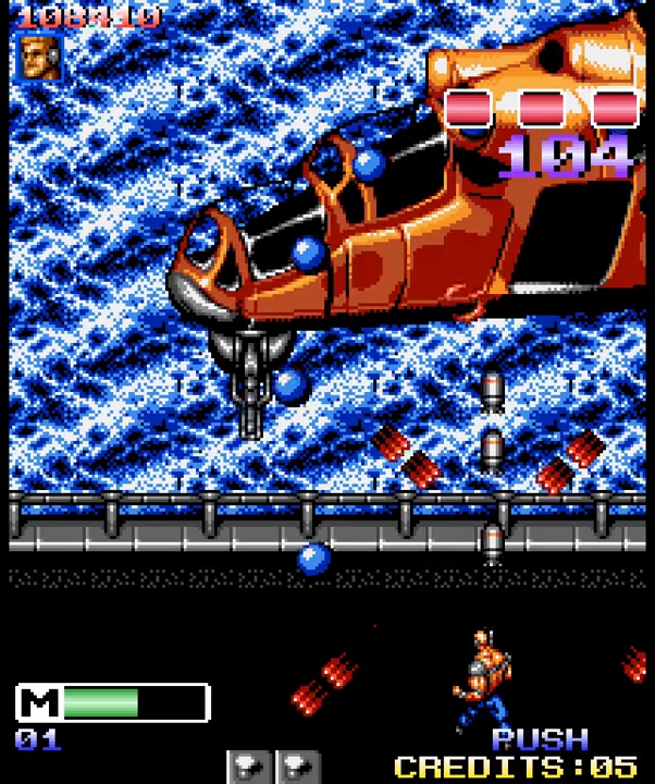 As well as enemies on foot there were also big bosses in vehicles like helicopter gunships which would require a heck of a lot of shooting to bring down but fortunately during the level, players could upgrade their regular gun to something much more powerful such as an assault rifle, shotgun or grenade launcher. There were also smart bombs that would kill all enemies on screen (not including the boss).