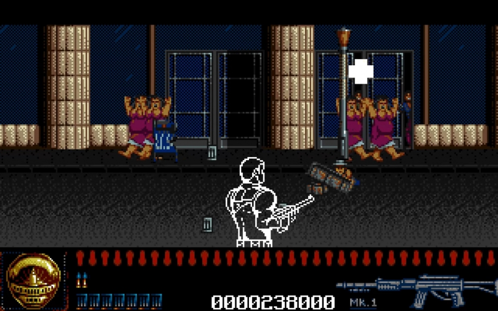 As with the film, the video game is set in Los Angeles in the baking hot summer of ’97. There’s war on the streets as drug lords fight cops and Detective Lieutenant Mike Harrigan (played by Danny Glover in the films) is determined to stop the influx of drugs onto the streets. Taking the role of Harrigan, players scroll horizontally along the screen in a Operation Wolf style shooting the various bad guys that run into view, pop up from behind a crate and being careful not to accidentally kill the civilians who seem intent on running into a bullet. Players also have to contend with the Predator also lobbing the occasional projectile at them, although they can’t do anything about him until the finale.