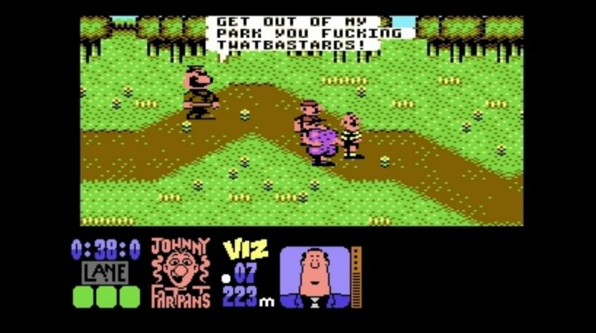 The rude comments from the other Viz characters became pretty annoying after the second time you saw it. Commodore 64 screenshot.