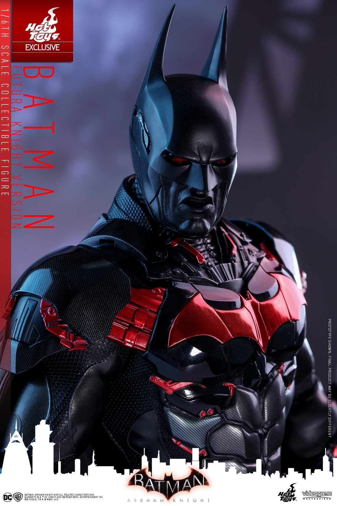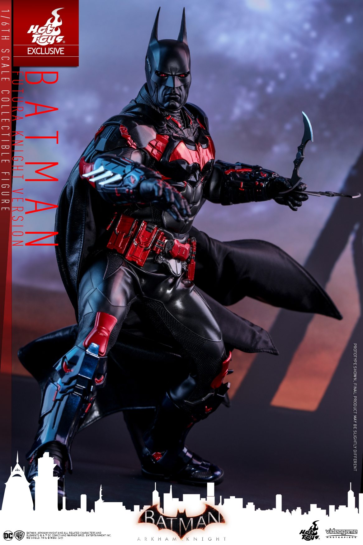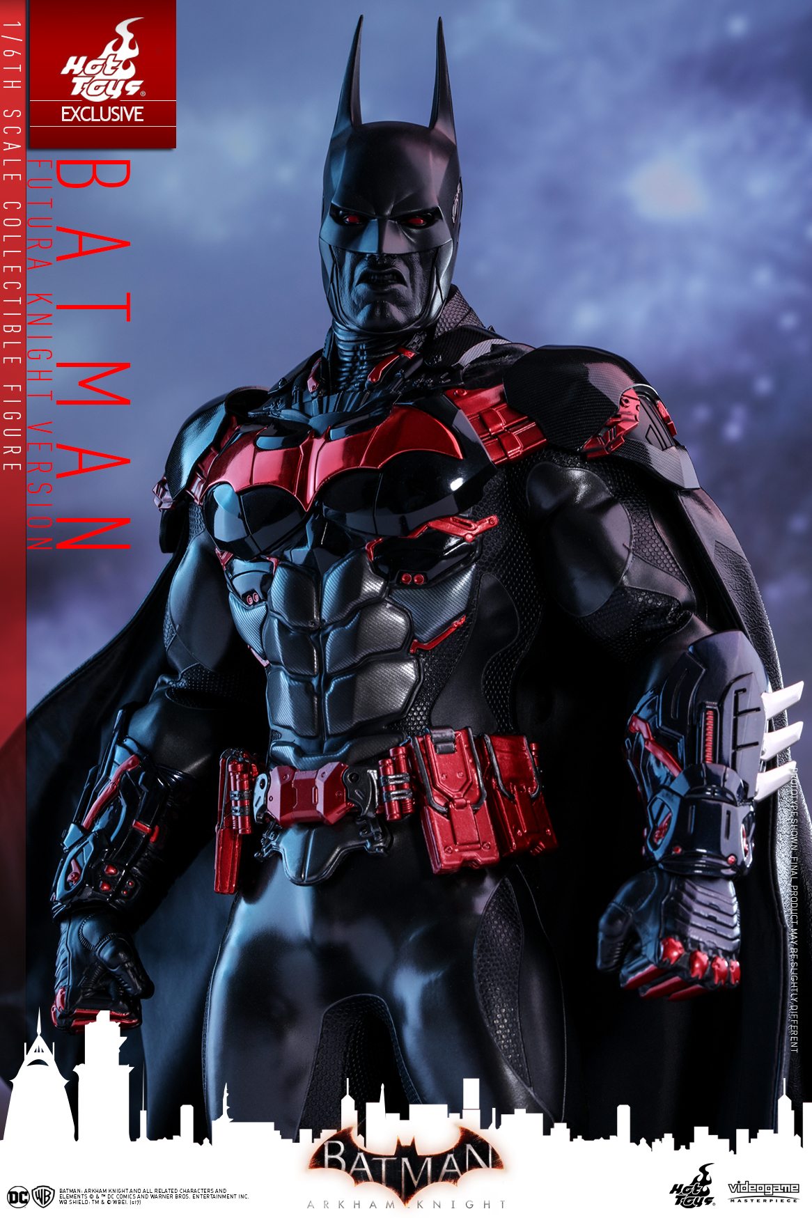 Inspired by the stylish Batman Beyond skin in the video game, the 1/6th scale Batman (Futura Knight Version) features a newly painted head sculpt with red eyes and two interchangeable black colored neutral and fierce expression lower faces, a masterly tailored multi-layer and multi-texture Batsuit with glossy red-colored electroplated Batman logo on the chest armor as well as glossy black and red colored armor plating throughout the body, a new Batman Beyond style Batarang, variety of Batman gadgets including grapnel gun, disruptor, REC gun, freeze grenade and many more!