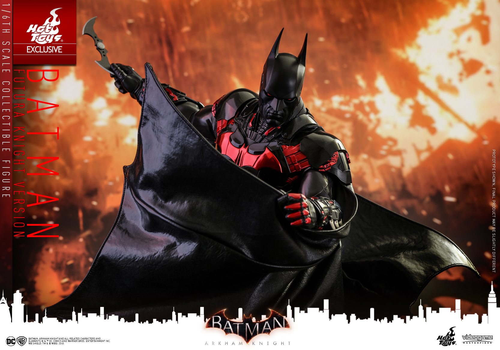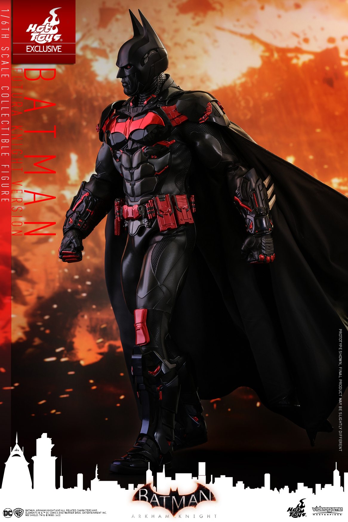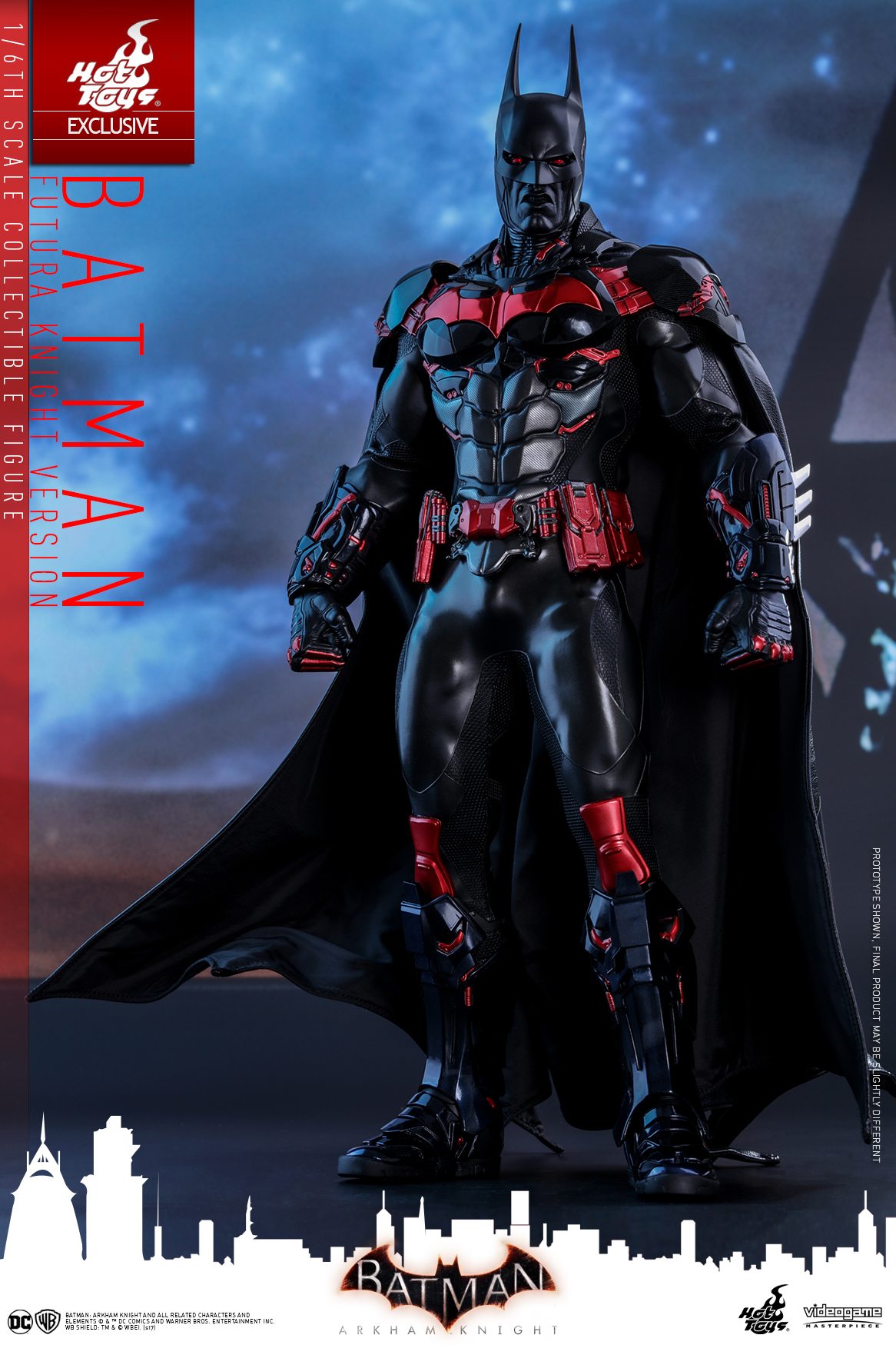 Inspired by the stylish Batman Beyond skin in the video game, the 1/6th scale Batman (Futura Knight Version) features a newly painted head sculpt with red eyes and two interchangeable black colored neutral and fierce expression lower faces, a masterly tailored multi-layer and multi-texture Batsuit with glossy red-colored electroplated Batman logo on the chest armor as well as glossy black and red colored armor plating throughout the body, a new Batman Beyond style Batarang, variety of Batman gadgets including grapnel gun, disruptor, REC gun, freeze grenade and many more!