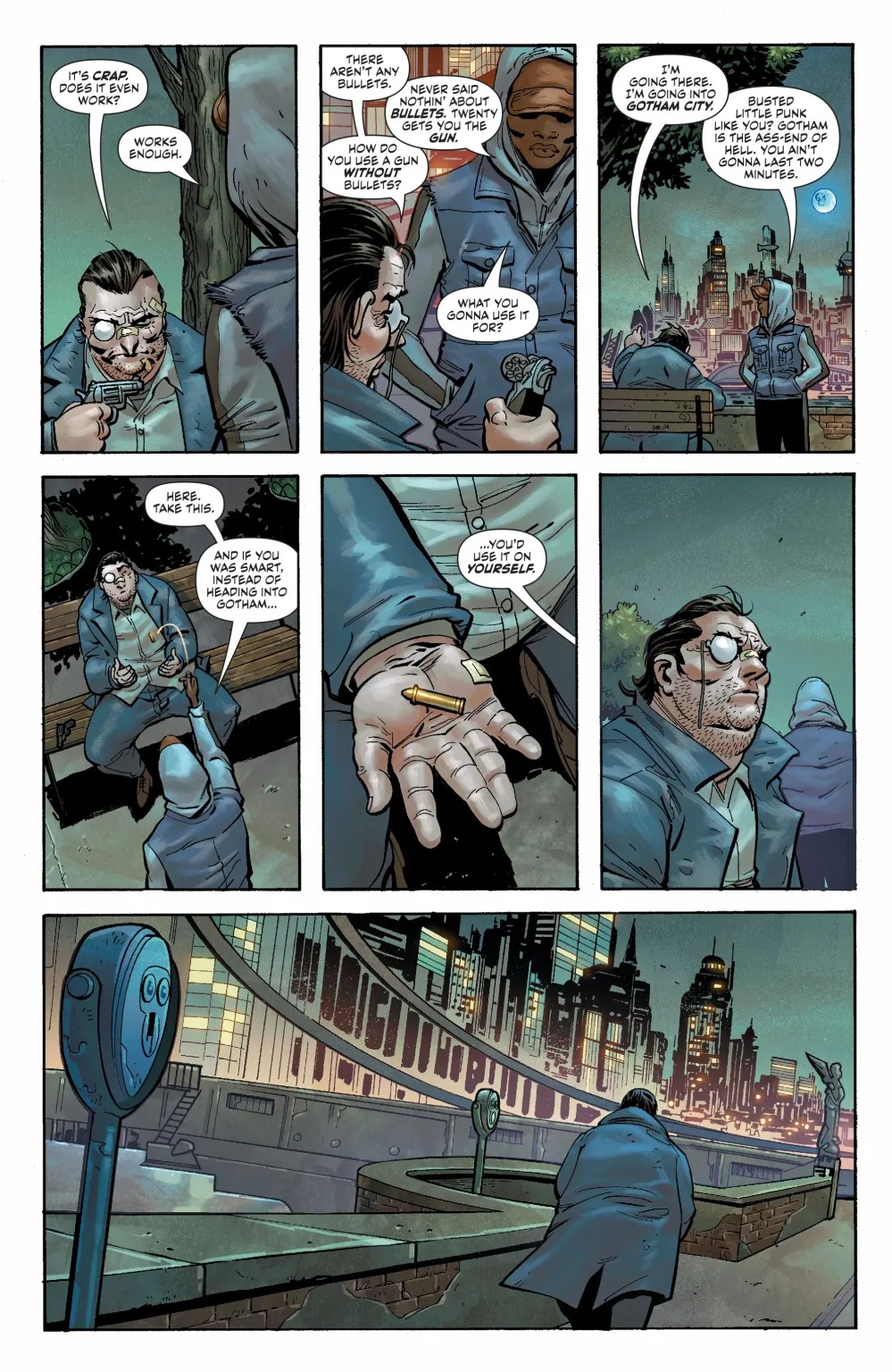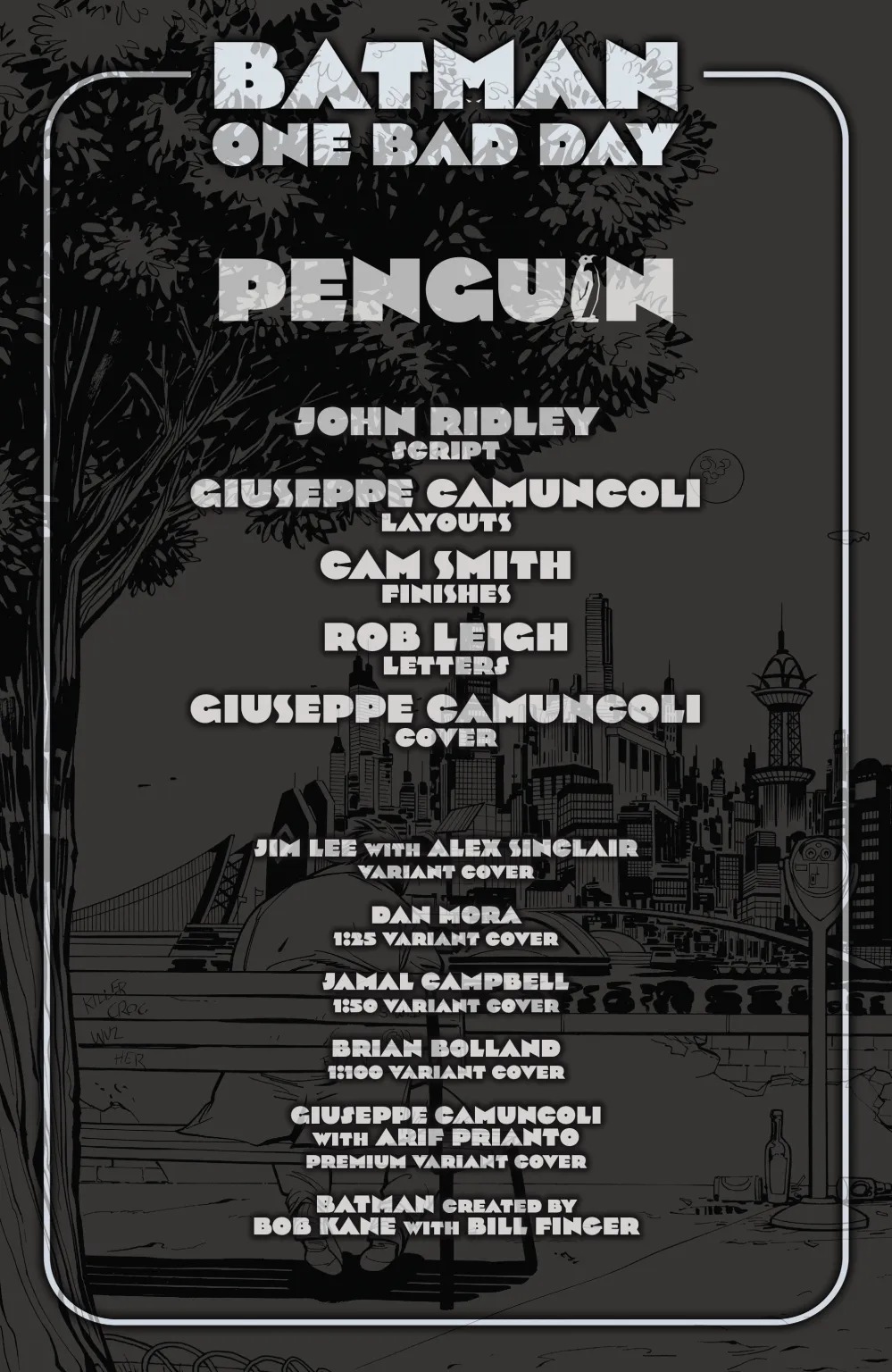 The Penguin’s criminal enterprise and the Iceberg Lounge have been stolen from underneath him by his former associate the Umbrella Man. The Umbrella Man has removed all of the rules for crime in Gotham City that the Penguin put in place, and the city is in chaos. The Penguin is a broken man, and he’ll have to travel through the burning streets of Gotham with a gun and a single bullet putting together a new crew to take back what he’s built. Will Batman help the devil he knows or face the devil he doesn’t in the form of the Umbrella Man? A crime epic from the team behind the critically acclaimed Other History of the DC Universe, John Ridley and Giuseppe Camuncoli—don’t miss it!