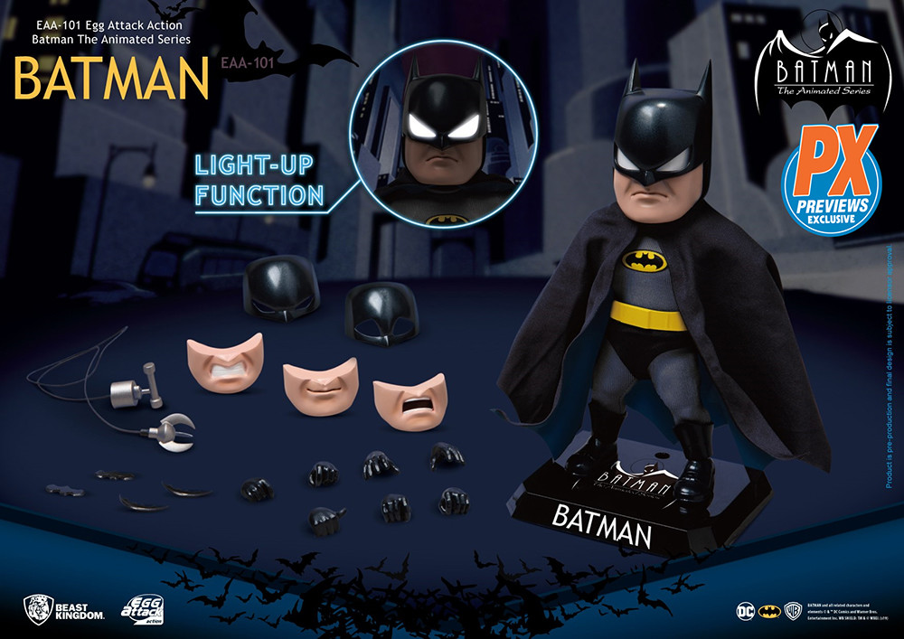 Based on the 1992 animated series version of Batman voiced by Kevin Conroy, this PREVIEWS Exclusive Egg Attack Action figure marks the first of Beast Kingdom’s new range of six inch, highly posable action figures based on the world of DC superheroes. Batman includes a variety of faithfully recreated accessories and materials that perfectly capture the film-noir aesthetics seen in the show. Everything from the real cloth tights, fabric cape, replacement eye masks and mouth shapes, to the light up eyes go a long way to making this figure a definitive Batman the Animated Series collectible. Accessories include multiple interchangeable hands, grapnel gun, a variety of batarangs, and unique display stand.