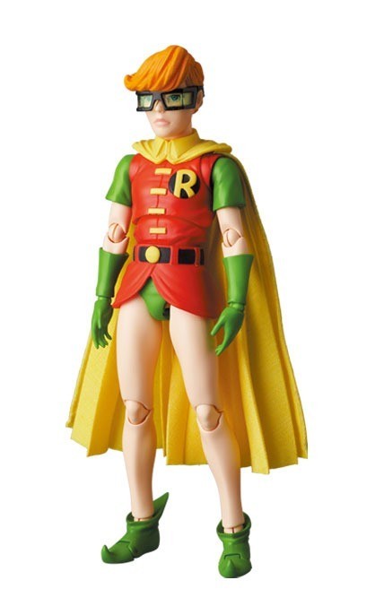 These figures feature outstanding poseability and a movable stand. A variety of scenes can be reproduced using the attached cloth cloak with wires. Batman is featured in a blue version and includes a Bruce Wayne head. Reproduce action scenes with the same scale Robin figure!