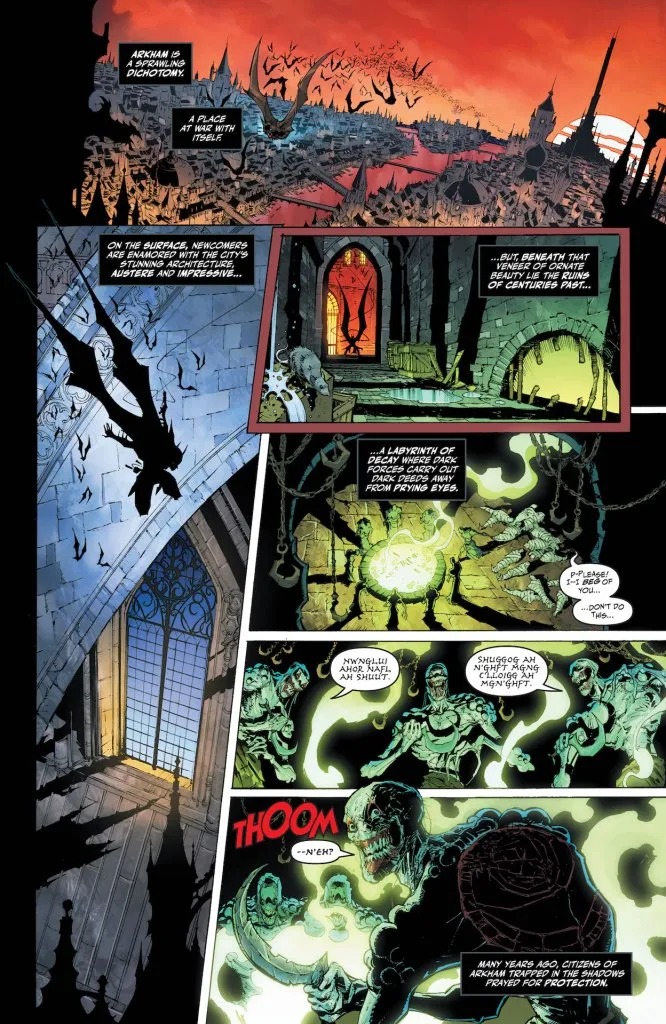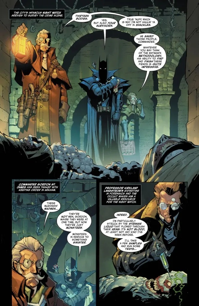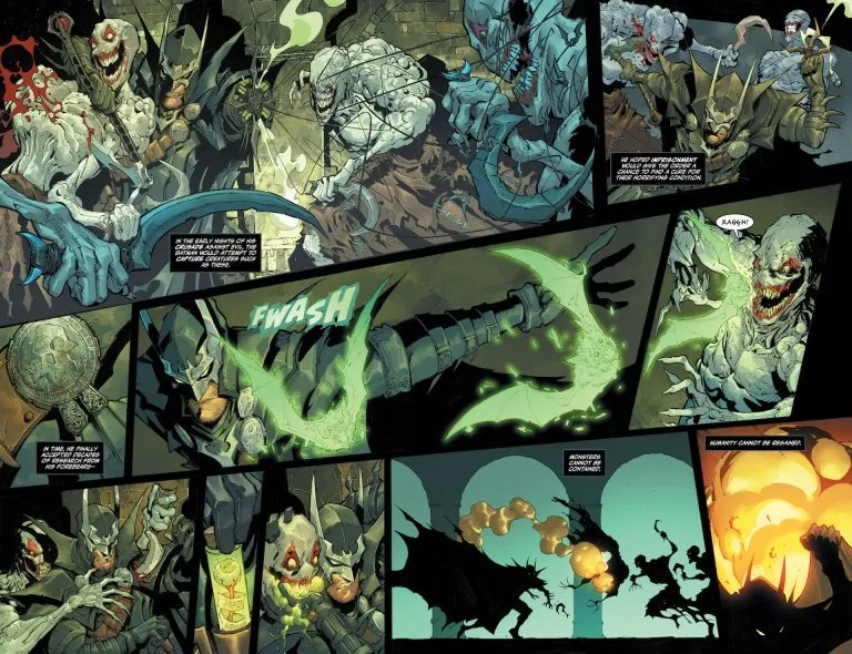 Jim Zub and Max Dunbar take us to the world of Batman, monster hunter! What is the Murder Club and how are they going to rock Batman’s world forever in the start of a four-part epic by Joey Esposito and Sergio Acuña? Chris Burnham’s epic Alfred saga draws to a close! And Nadia Shammas and Jahnoy Lindsay craft a deadly parenting short story starring Batman and Talia al Ghul, battling for the soul of their son, Damian.