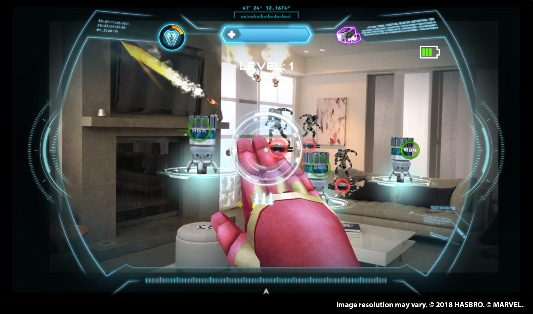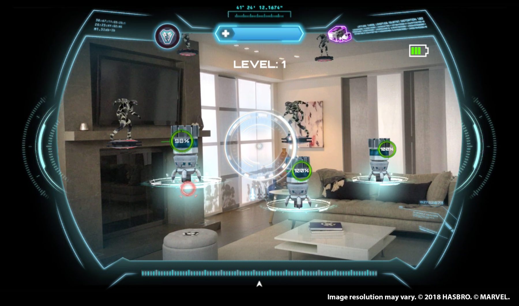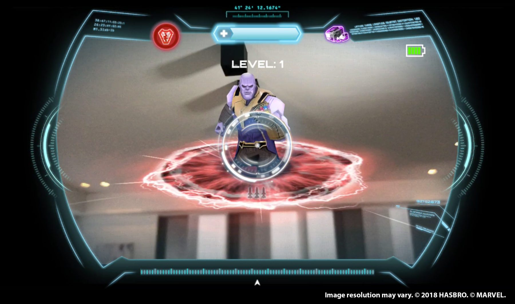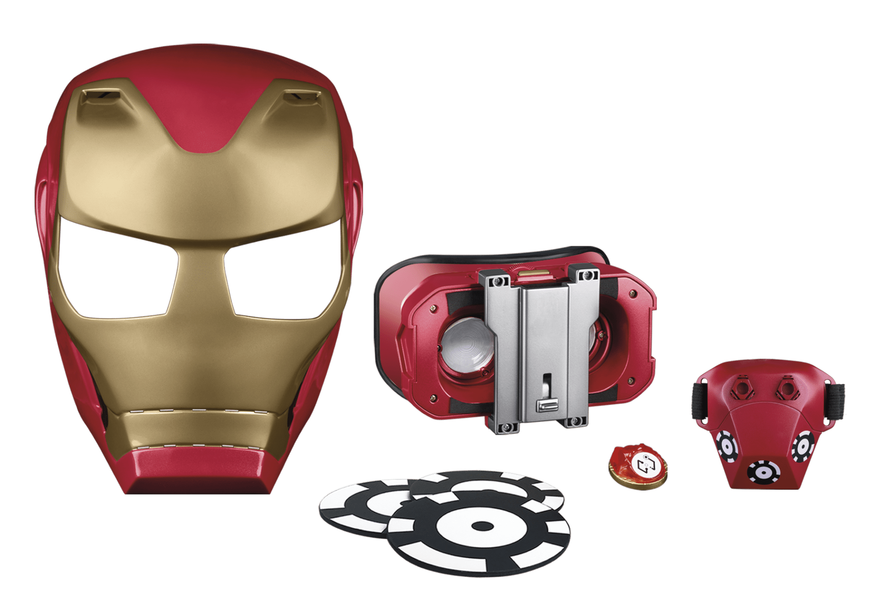 Battle like Iron Man with the HERO VISION IRON MAN AR EXPERIENCE! This movie-inspired mask features a new experience from Hasbro that combines iconic role play with Augmented Reality (AR) technology. Download the HERO VISION app, place a compatible device inside the AR goggles, place AR markers around the play area, put on the AR mask, and then get ready to see digital images from the Super Hero’s world in front of kids’ eyes. Includes AR mask, AR goggles, gauntlet, three AR markers, and one Infinity Stone.