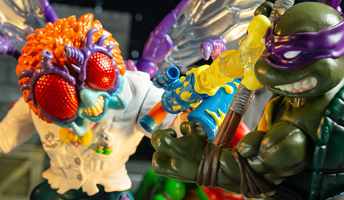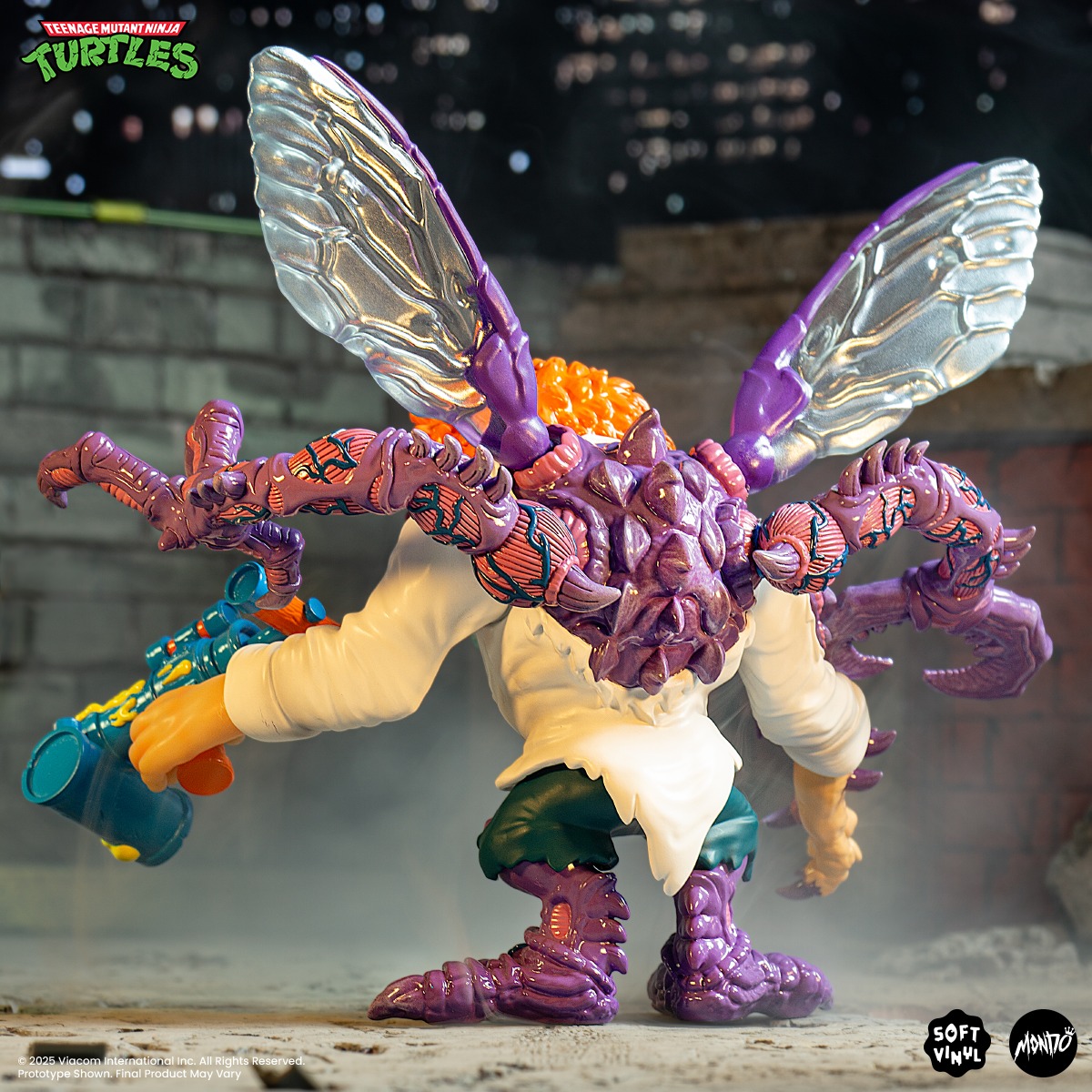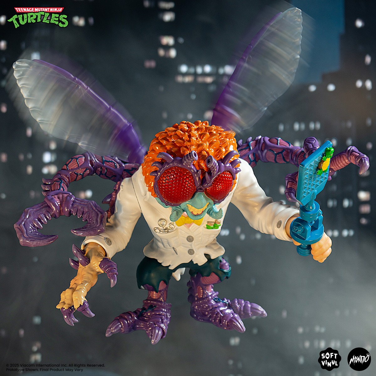 Our premium TEENAGE MUTANT NINJA TURTLES soft vinyl line features fully articulated figures Inspired by classic TMNT and Japanese sofubi. Complete with Anti-Turtle Swatter and Muta-Zoo Ray Gun, our massive Baxter Stockman Soft Vinyl Figure features tons of awesome details like translucent wings and a gnarly mid-transformation arm.