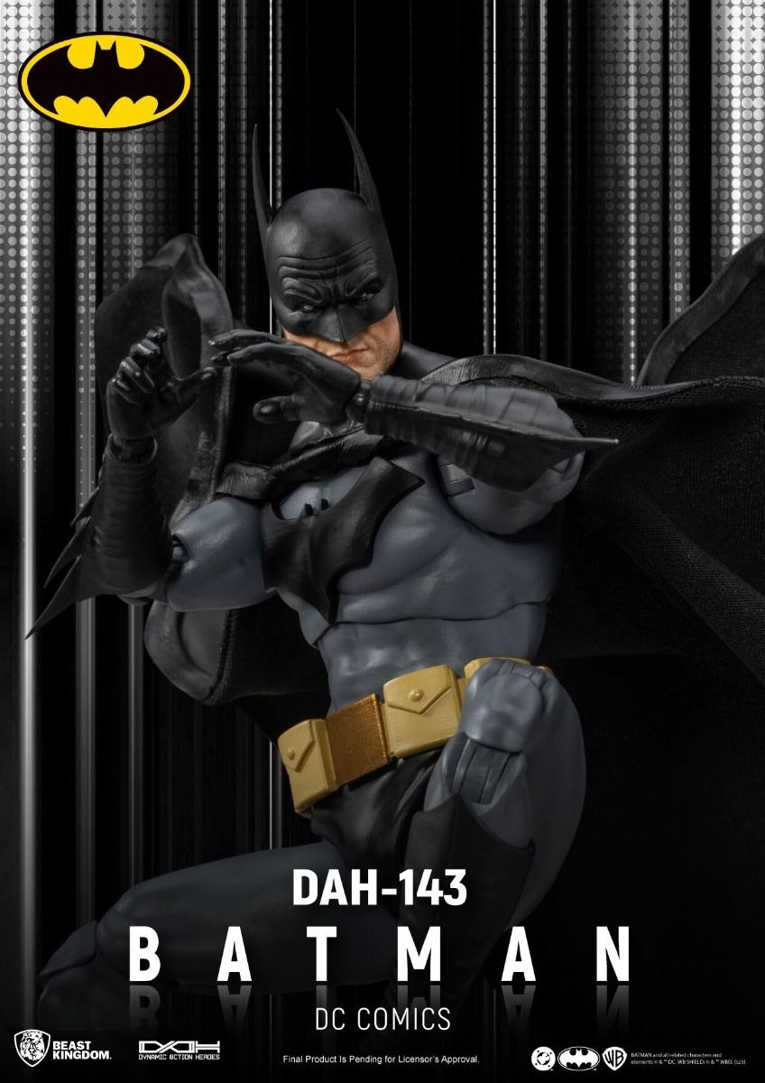 The DAH-143 figure captures Batman’s intense stare beneath his cowl, with detailed sculpting of facial texture and muscular physique. Dressed in a gray battle suit with a yellow utility belt, black gloves, boots, and a premium fabric cape with inner wire for dynamic posing.