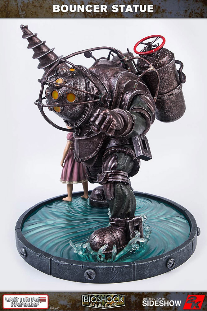 The BioShock: Big Daddy – Bouncer statue has been depicted as it is shown on the box cover art for the game with the Bouncer having its Drill at the ready and a Little Sister by its side.