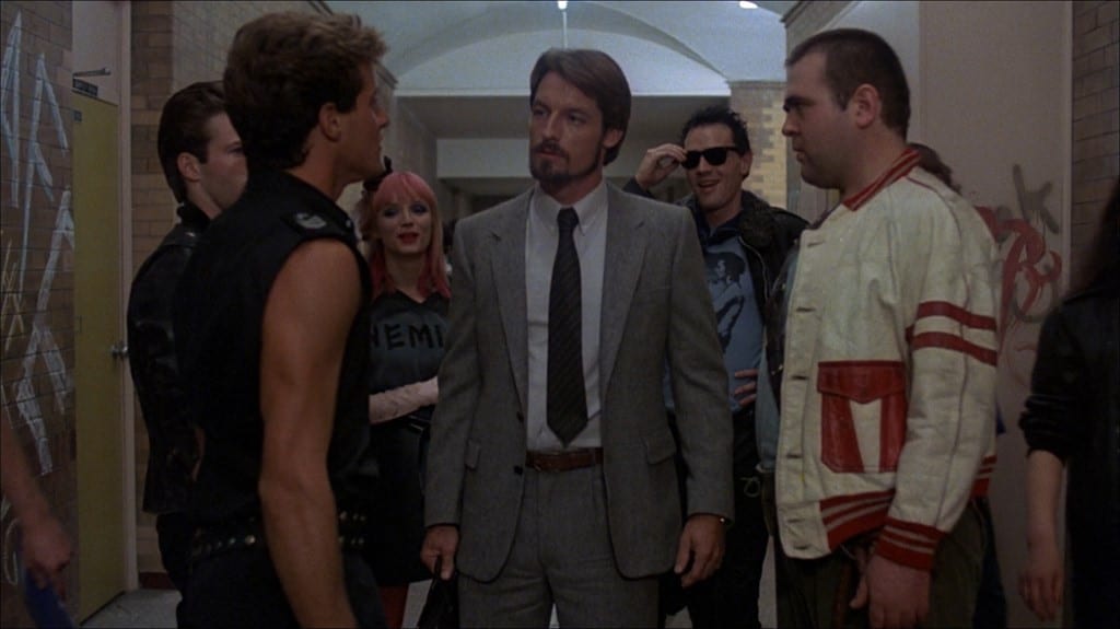 Also, a very young Michael J. Fox, complete with puppy fat and pudding bowl haircut, shows up as one of Norris’ students, and apart from his slightly awkward appearance, you can see flickers of the charismatic screen presence that would endear him to audiences a couple of years later. But despite having some very likeable protagonists, Class of 1984 suffers a little when it comes to the antagonists as they are a fairly unremarkable looking bunch. They all have bad attitudes and commit acts that force us to dislike them but unfortunately they are a fairly non-descript looking bunch and, apart from Stegman, are very forgettable. Stegman himself is a strange character as he acts like a total scumbag but looks like a coiffured ‘80s pop star, making the punk outfits that he wears look even dafter than they already did. Remember when Spandau Ballet grew their hair out a bit and wore leather duster coats? Yeah, that.