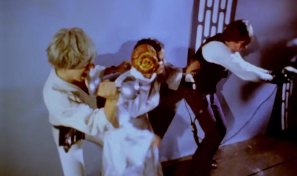 The robot 4-Q-2, who resembles the Tin Man from The Wizard of Oz, and Artie Deco, a plucky droid who looks suspiciously like a canister vacuum cleaner, go along for the ride. Ham Salad’s spaceship is an iron, the Death Star is a waffle iron, and the laser blasts were created by scratching the film negative. When Chewchilla gets hungry, he munches on the cinnamon rolls that adorn the princess’s head.