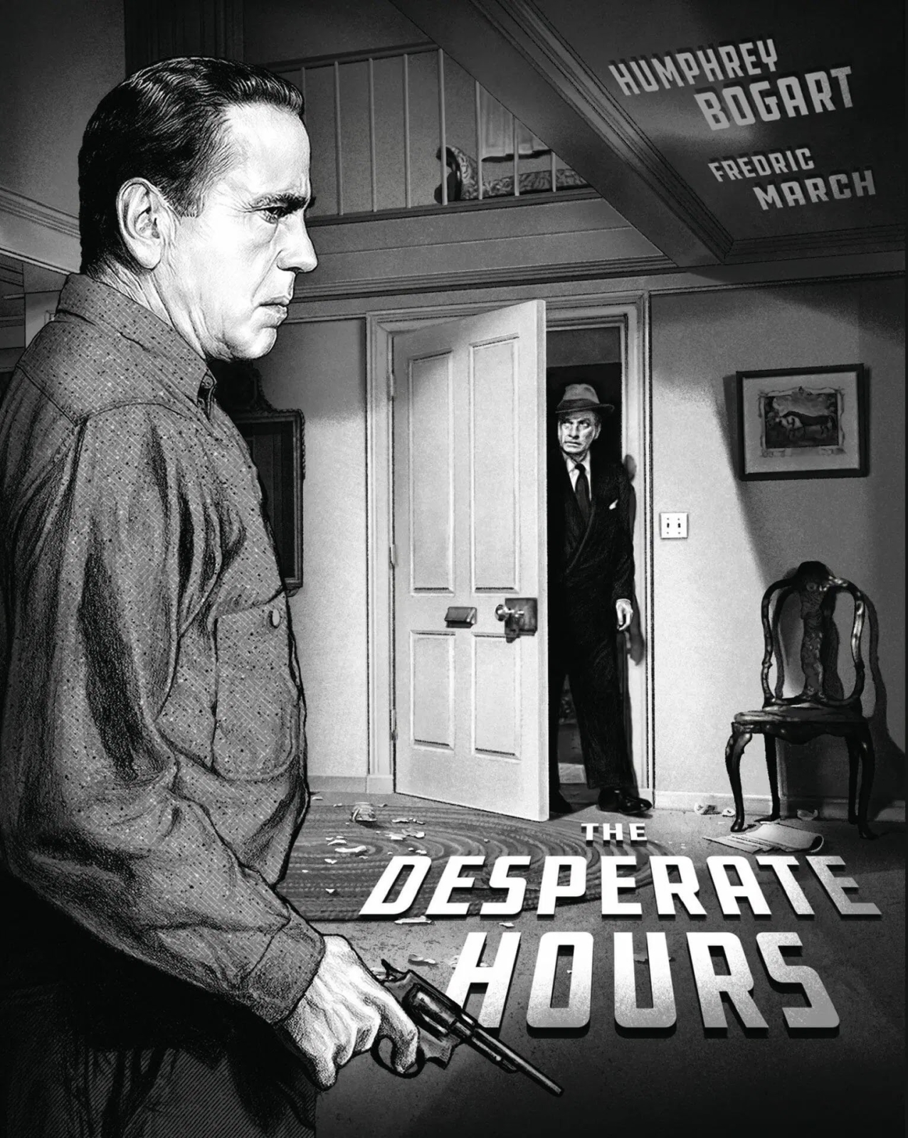 Based on the novel and play of the same name by Joseph Hayes, who shares co-screenwriting credit with Jay Dratler, The Desperate Hours was directed by William Wyler and stars Humphrey Bogart as Glenn Griffin, the leader of three escaped convicts who invade the Indianapolis home of Dan Hilliard (Fredric March).