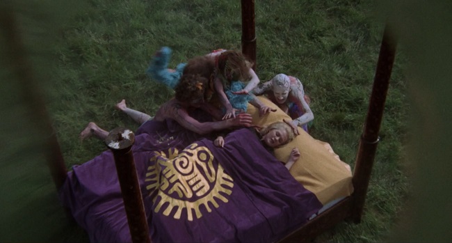 Indeed, Corman served as Executive Producer – well, that’s what he is credited as but his fingerprints are everywhere – and the dream sequences he peppered throughout his run of Edgar Allan Poe adaptations in the 1960s are here also, populated by topless hippies seemingly on their way back from a Frank Zappa gig and getting excited by blonde haired sacrificial lamb Nancy spreading herself over a randomly placed altar. We know it is a dream sequence because the camera lens is smeared with Vaseline and, thanks to a clean HD print, the crew hand who rubbed the petroleum jelly-based lubricant on the lens could probably be identified by their fingerprints.