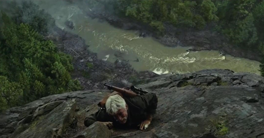 Both of those events do happen but context is key and they are merely incidental events in a story that plays out as a character study, not only of a man but also of an idea, that being the all-American hero; the patriot, if you will. Along with that character study you still get flashes of the film that your brain automatically imagines when you first hear that title – a snippet of a Rambo-esque tooling-up scene as Calvin Barr selects the weapons he requires to go and kill the Bigfoot, complete with ‘70s grindhouse-style zoom-in, along with some gorgeous wide shots of the landscape as Barr goes up to the wilds of Canada to hunt the creature, evoking more picturesque survival action movies such as Southern Comfort, Deliverance and First Blood – but between those set pieces the film flashes back to Barr’s younger years where, after killing Hitler, he meets and falls in love with schoolteacher Maxine (Caitlin FitzGerald – It’s Complicated) but the weight of his military life and the aftermath of what he did for his country whilst in Germany means he has to sacrifice love and happiness for duty.
