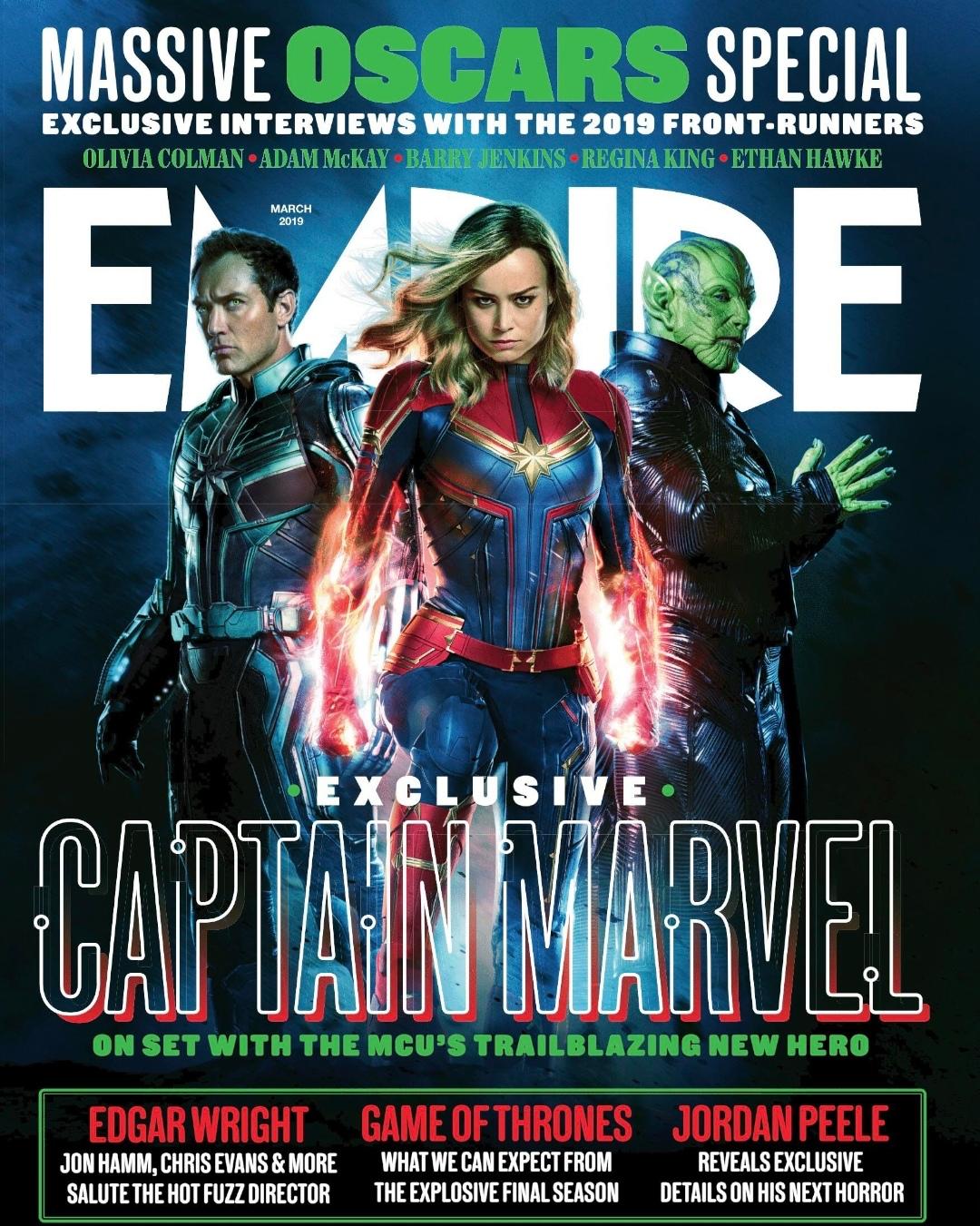 Empire Magazine has released its March cover featuring Carol Danvers (Brie Larson), Talos (Ben Mendelsohn) in full Skrull form and ‘Star Commander’ (Jude Law) from the upcoming Marvel superhero solo movie Captain Marvel; take a look here…