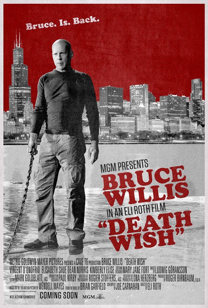 Dr. Paul Kersey (Bruce Willis) is a surgeon who only sees the aftermath of Chicago violence when it is rushed into his ER – until his wife (Elisabeth Shue) and college-age daughter (Camila Morrone) are viciously attacked in their suburban home. With the police overloaded with crimes, Paul, burning for revenge, hunts his family’s assailants to deliver justice. As the anonymous slayings of criminals grabs the media’s attention, the city wonders if this deadly vigilante is a guardian angel or a grim reaper. Fury and fate collide in the intense, action-thriller DEATH WISH.