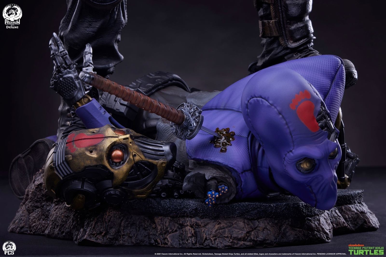 Casey’s man-made and decidedly low-tech equipment stand in contrast to the defeated cybernetic Foot Clan soldier that comprises the bulk of the statue’s base. The vibrant purple Foot uniform and exposed metallic endoskeleton underneath are beautifully painted to highlight these clashing methodologies.