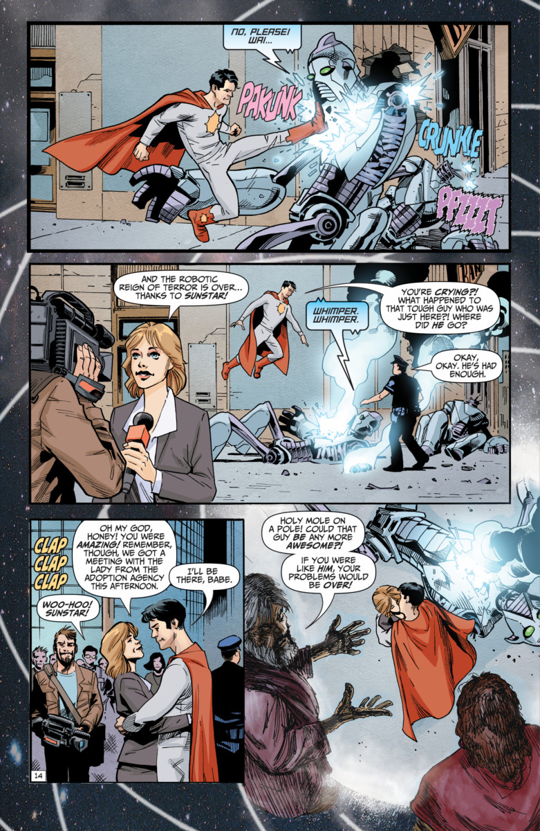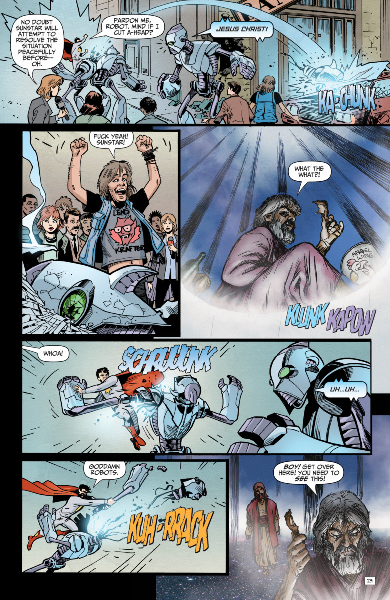Created by New York Times bestselling writer Mark Russell and acclaimed artist Richard Pace, Second Coming sees God commanding Earth’s mightiest superhero, Sunstar, to accept Jesus Christ as his roommate and teach him how to use His power in a… more powerful way. Jesus, shocked at the way humans have twisted his message over two millennia, vows to straighten it out.