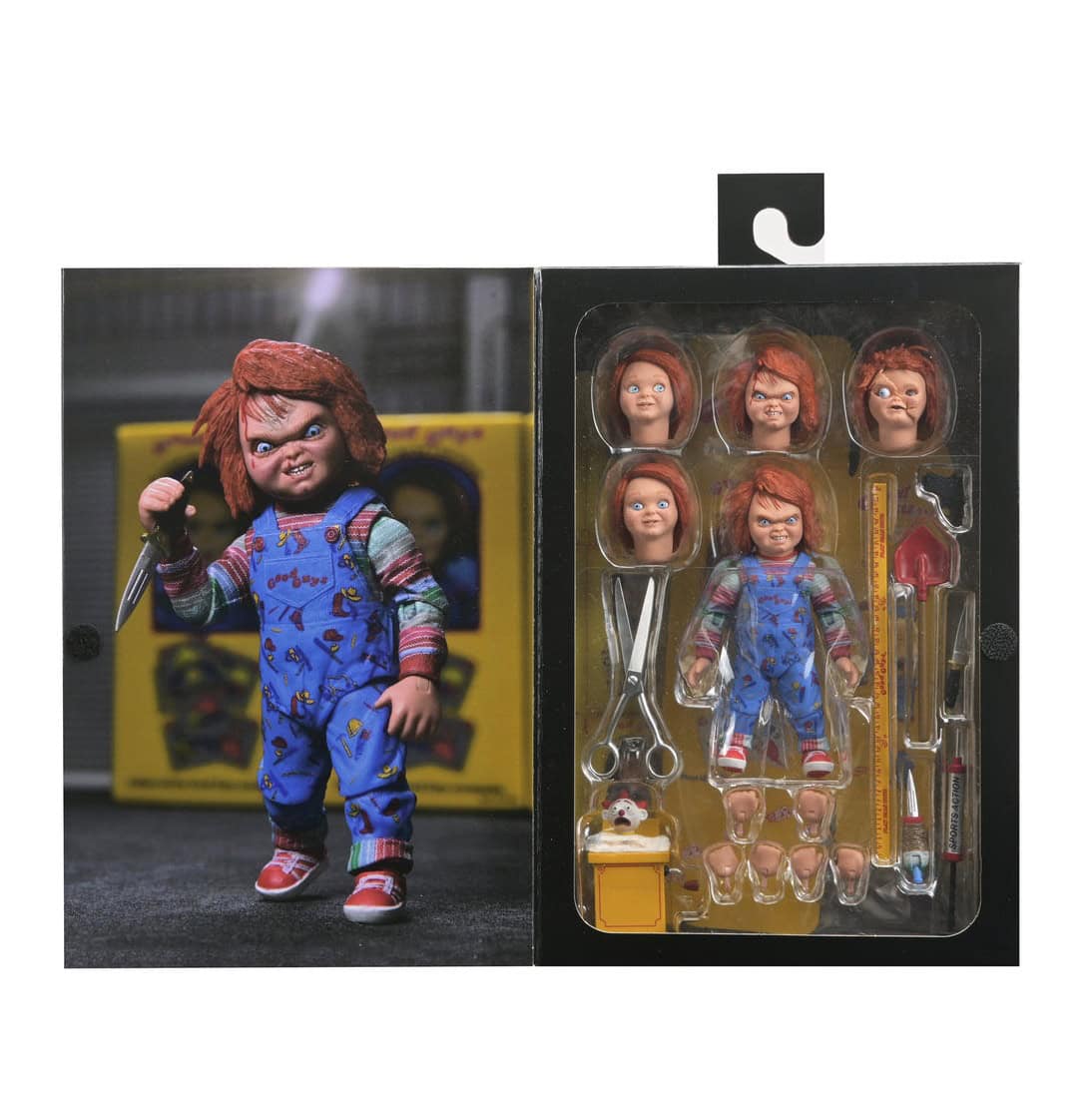 Chucky comes with five interchangeable heads, multiple hands, an alternate forearm, ruler, air pump, knife, Good Guy shovel, jack-in-the-box and scissors from the iconic theatrical poster, and more.