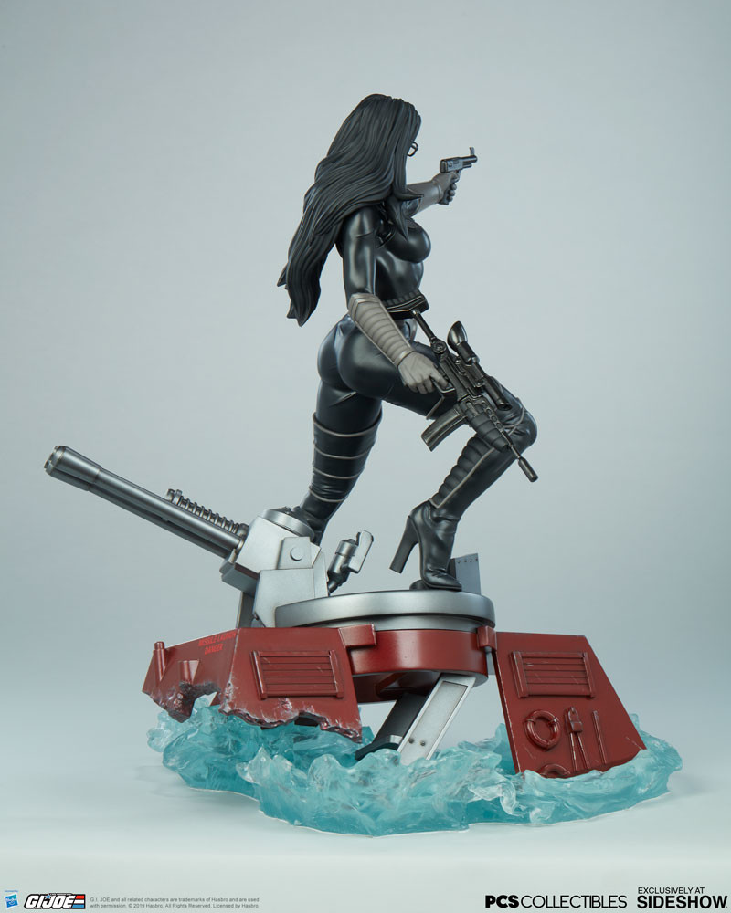 The Baroness Statue measures 22” tall as the ruthless lieutenant straddles the turret cannon of the Moray while it sinks beneath the water. Blue translucent waves churn against the red hydrofoil as Baroness stands her ground, waiting for extraction from the battle against G.I. Joe.